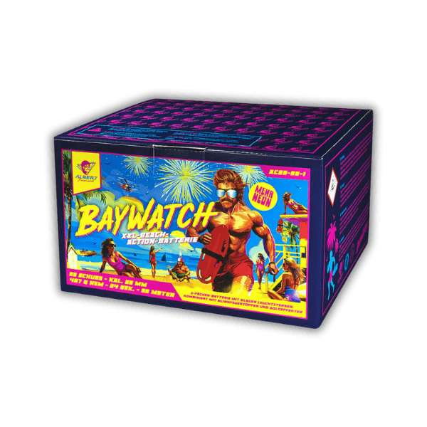 Die Albert Baywatch ist eine kraftvolle 35-Schuss-Batterie der Kategorie F2 im 25 mm Kaliber. Über ca. 24 Sekunden Laufzeit liefert dieser 1.4G-klassifizierte Artikel eine dominante und präzise Show. Der Cake feuert wuchtige Fächer-Salven, die den Himmel mit einer Kombination aus hellen Goldblinkern und leuchtend blauen Sternen füllen.