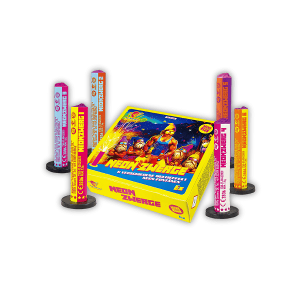 Die Albert Neon Zwerge (Funke) sind sechs Multieffekt-Neon-Fontänen mit lebhaften Blinkern und Chrysanthemen – u. a. Grünblinker mit Neonsternen (Lemon/Pink), Silber- & Goldchrysanthemen, Weißblinker sowie Gold- und Silberfunken mit Knallsternen; Jugendfeuerwerk ab 12 Jahren.