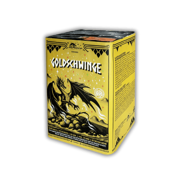 Die Draco Goldschwinge ist eine imposante F2-Batterie, die ein beeindruckendes Spektakel mit einem einzigartigen Aufstiegseffekt bietet. Jeder Schuss beginnt mit einem tiefen, sonoren Tieftonsilberpfeifaufstieg, der sich am Himmel in prachtvolle Goldpalmbuketts verwandelt. Diese Buketts sind zusätzlich mit intensiven Blinkern in den Farben Rot, Gold, Weiß und Grün gespickt. Die gesamte Show wird von einer kräftigen Finalsalve aus ohrenbetäubenden Titansaluts abgeschlossen.