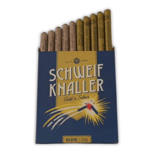 Der Schweifknaller von FKF ist ein beeindruckender, Made in Germany Böller, der Knall und Leuchteffekt kombiniert. Jeder der 10 Böller pro Packung sorgt mit seinem spektakulären Knall für Aufsehen. Der Böller wird von einem leuchtenden Gold- oder Silberregen begleitet, welcher zusätzlich eine beeindruckende Atmosphäre schafft. Ein kraftvoller Artikel, der ein unvergessliches Erlebnis bietet, das über den reinen Knalleffekt hinausgeht.