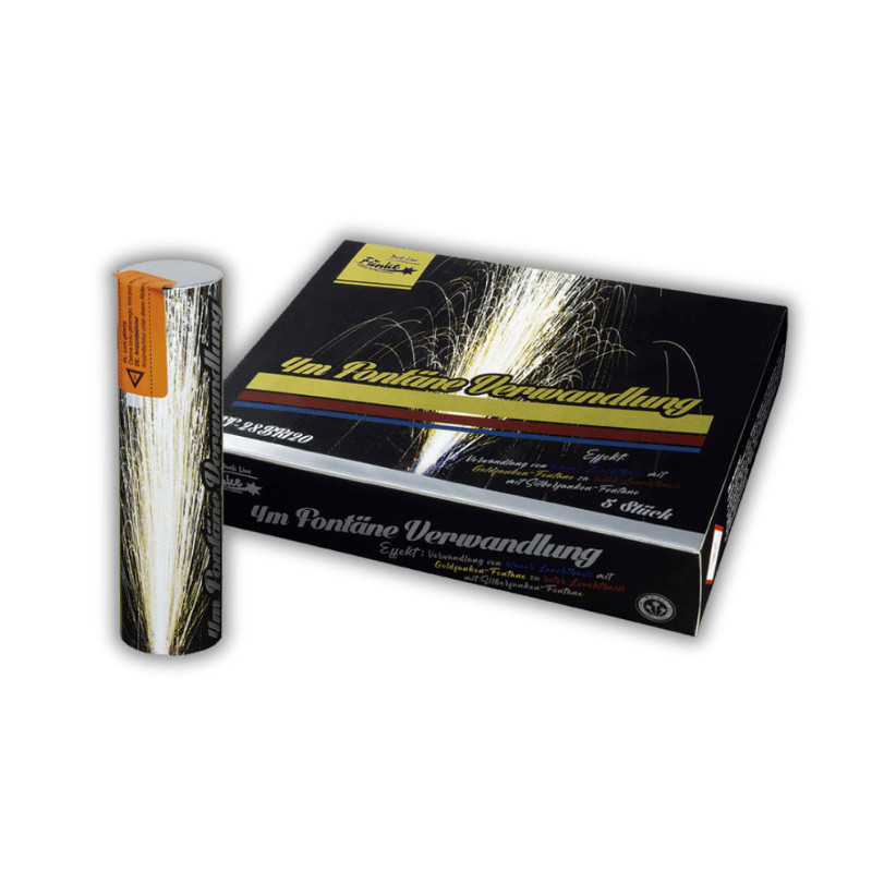 Die Funke 4m Fontäne Verwandlung ist ein Artikel der Kat. T1 und ganzjährig frei verkäuflich. Auf Nitrozellulose-Basis gefertigt, brennt sie besonders raucharm und beeindruckt mit einem Verwandlungseffekt: von blauer Leuchtbasis mit Goldfunken zu roter Leuchtbasis mit Silberfunken. Ideal für professionelle Shows und Bühnenanwendungen. Preis pro Stück.