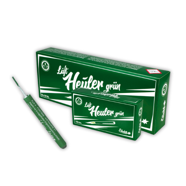 Die Funke Luftheuler Grün sind klassische Heuler mit einem nostalgischen Effekt in kompakter Bauform. Es handelt sich um pfeifende Fontänen mit einem charakteristischen, steigenden und schrillen Ton. Beim Aufstieg erzeugen sie zusätzlich einen gut sichtbaren grünen Effekt. Jede Schachtel enthält 10 Stück dieser beliebten kleinen Artikel. Die grünen Luftheuler sind perfekt für alle, die den klassischen, schrillen Heuler-Effekt in handlicher Form lieben und eine optische Ergänzung in strahlendem Grün wünschen.