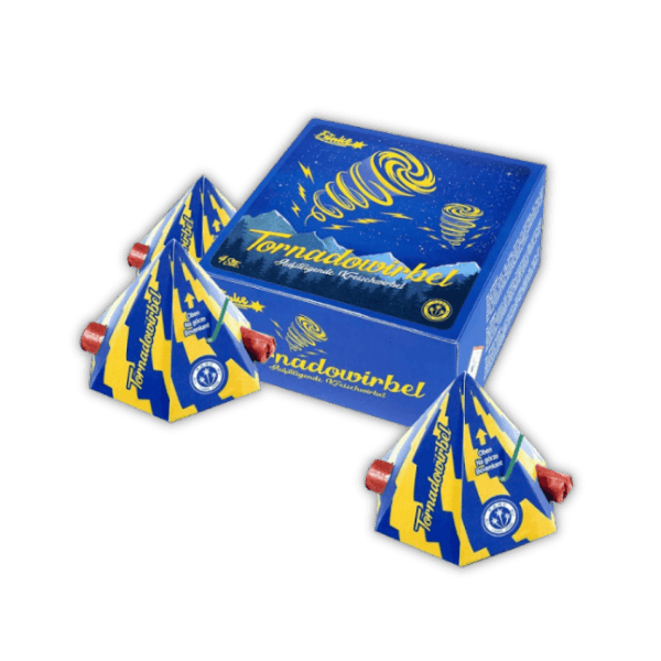 Der Funke Tornado Wirbel (FW44A, F2, ADR 1.4G) ist ein Titanfunken-Pfeifwirbel mit schrillem Dreh, der anschließend mit grüner Leuchtbasis aufsteigt – rasant, laut und markant im Bild.