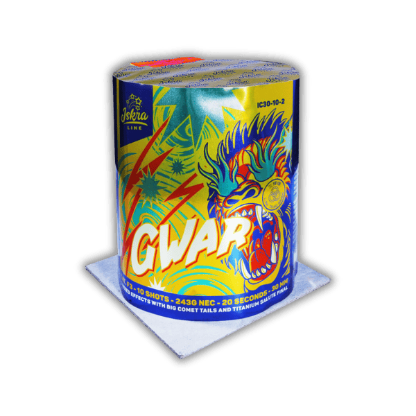 Die Iskra GWAR ist eine wuchtige 10-schüssige Feuerwerksbatterie der Kategorie F3. Im imposanten 30 mm Kaliber und mit 243 g NEM liefert sie innerhalb von ca. 20 Sekunden eine Abfolge von 5 gemischten und extrem großen Effekten. Jeder Schuss steigt mit einem mächtigen Kometenschweif auf, bevor er sich in den Himmel entlädt. Erleben Sie Brokatkronen mit blauen/purpurnen Dahlien, rote/gelbe Dahlien mit Weißblinkern und riesige Titangold-Weiden mit roten Dahlien/blauen Päonien. Die Show endet mit einem Titanium Salute Finale, das einen kräftigen, lauten Schlag als würdigen Abschluss setzt.