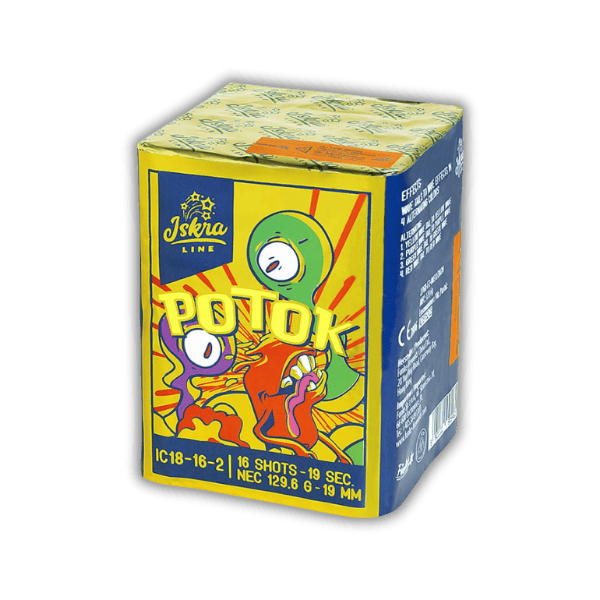 Die Feuerwerksbatterie Potok ist eine dynamische 16-Schuss-Batterie der Kategorie F2 im 18 mm Kaliber. Über ca. 19 Sekunden Laufzeit liefert dieser Artikel aus dem Hause Iskra eine farbenfrohe Performance mit 129,6g NEM. Die Show besticht durch einen abwechslungsreichen Rhythmus aus aufsteigenden Wave-Schweifen, die sich in vier leuchtenden Farben zu intensiven Wave-Effekten entfalten. In stetigem Wechsel erleuchten Gelb, Violett, Grün und Rot den Himmel und machen die Potok trotz ihrer kompakten Bauweise zu einem echten Blickfang.