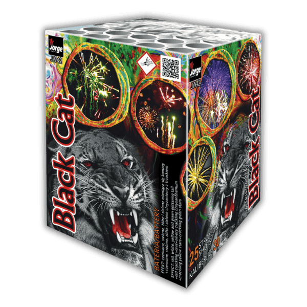 Die Jorge Black Cat ist eine leistungsstarke 25-Schuss-Batterie der Kategorie F3 im wuchtigen 30 mm Kaliber. Sie liefert eine farbenfrohe und intensive Show über ca. 35 Sekunden. Die Batterie kombiniert leuchtstarke, glänzende Blink-Kometen mit riesigen Chrysanthemen-Buketts, die mit kräftigem Riss- und Knistereffekt (Crackling) zerlegen. Die Effekte präsentieren sich in Rot, Silber, Gelb und Grün und füllen den Himmel majestätisch aus. Abgabe nur an Inhaber einer behördlichen Erlaubnis.