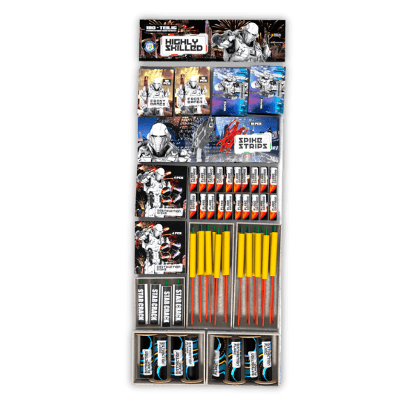 Das Lesli Highly Skilled ist ein 190-teiliges Jugendfeuerwerk-Sortiment mit Wirbeln, Crackling-Bällen, Fontänen und Heulern – u. a. Frost Bangs, Spike Strips, Flare Grenades, Destruction Disk, Screaming Arrows und Destruction Flares; vielfältig, laut und ab 12 Jahren ganzjährig erlaubt.