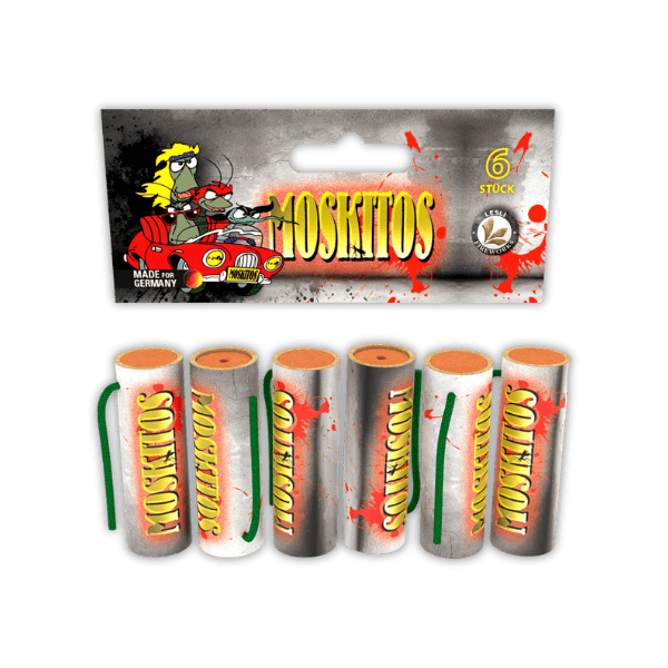 Die Lesli Moskitos starten mit schrillem Pfeifton schlagartig in die Luft und steigen bis ca. 15 m – klassischer Spaßartikel; 6 Stück pro Packung, Schachtel mit 24 Packungen.