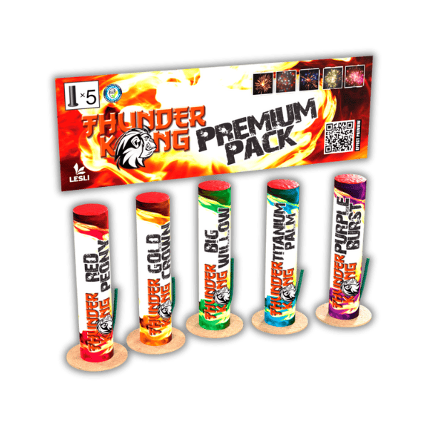 Das Lesli Thunder Kong Premium Pack ist ein Set aus dicken 25-mm-Röhren (Bombenrohre) mit einer Gesamt-NEM von 61,55 g. Jede Röhre überzeugt durch dicke Effekte und einen knallharten Burst (Zerleger). Das Set bietet insgesamt fünf verschiedene Farbexplosionen und ist für seine beeindruckende Lautstärke bekannt.