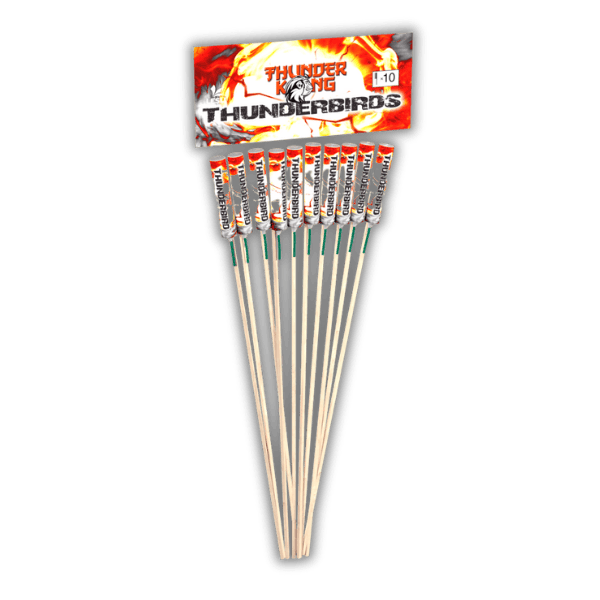 Die Lesli Thunderbirds sind ein 10er Raketen-Set mit einer Gesamt-NEM von 38,9 g. Die Raketen steigen kräftig mit einem intensiven Pfeif-Effekt auf und zerlegen sich am höchsten Punkt in einen lauten Knall, kombiniert mit einem roten Effekt.