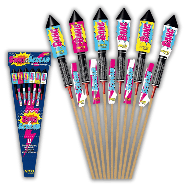 Das Nico Bang and Scream ist ein 11-teiliges Raketensortiment der Kategorie F2 mit insgesamt 164 g NEM. Die Raketen steigen bis zu 45 Meter hoch und liefern ein akustisches Doppel: Der Aufstieg erfolgt mit einem schrillen Heulton (“Scream”) und zerlegt am Zenit in einen kräftigen Knall (“Bang”) oder ein brillantes Farbbukett mit lautem Crackling. Dieses Sortiment sorgt garantiert für Lärm und Licht.