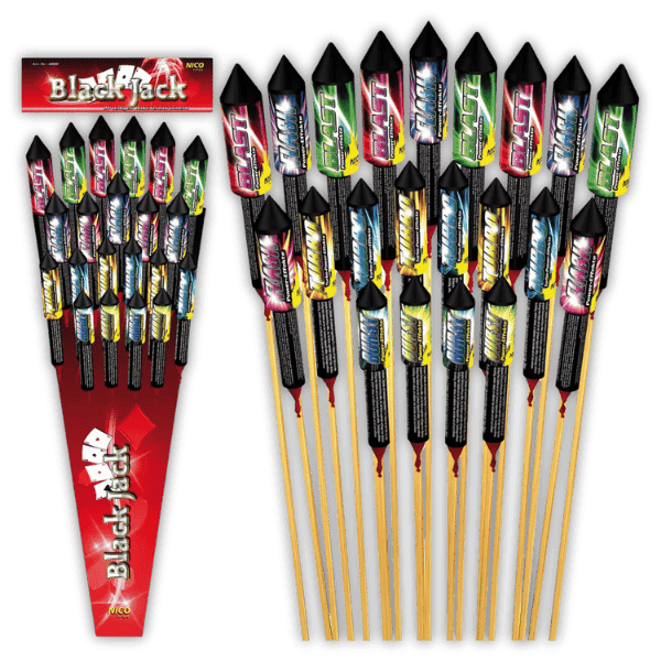 Das Nico Black Jack ist ein großes 21-teiliges Raketensortiment der Kategorie F2 mit beeindruckenden 355 g NEM. Die Raketen steigen bis zu 50 Meter hoch und bieten eine reiche Auswahl an Premium-Effekten. Das Sortiment kombiniert glänzende Gold- und Glitzer-Bukette, leuchtende Blinksterne und farbenprächtige Dahlien in verschiedenen Farben. Ein großzügiges Raketenset, das für Abwechslung und ein spektakuläres Himmelsbild sorgt.