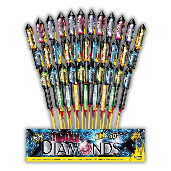 Das Nico Funky Diamonds ist ein riesiges 40-teiliges Raketensortiment der Kategorie F2 mit beeindruckenden 480 g NEM. Die Raketen steigen bis zu 50 Meter hoch und bieten eine glänzende, farbenfrohe Show. Das Sortiment enthält eine immense Vielfalt an brillanten, bunten Sternen und Glitzer-Effekten, die den Himmel wie funkelnde Diamanten erleuchten. Ideal für ein ausgedehntes und abwechslungsreiches Raketen-Feuerwerk.