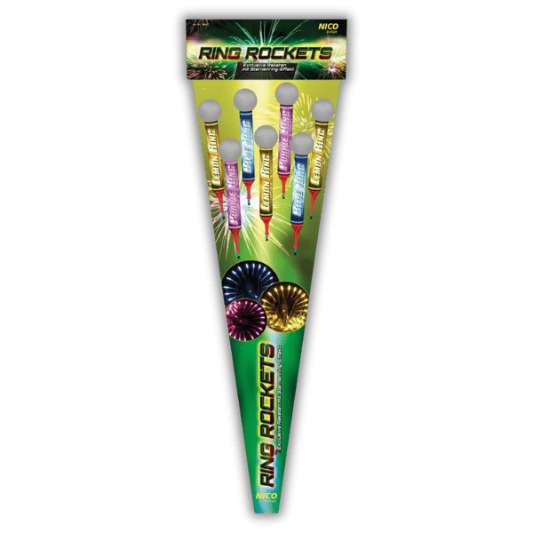 Die Nico Ring Rockets sind ein 7-teiliges Raketensortiment der Kategorie F2 mit insgesamt 78 g NEM. Die Raketen steigen bis zu 40 Meter hoch und zerlegen am Zenit in einen präzisen Ring- oder Kreis-Effekt (Ring-Bukett), der von bunten Sternen und Glitzer begleitet wird. Dieses Sortiment ist ideal für alle, die Raketen mit einzigartigen, figürlichen Effekten suchen.