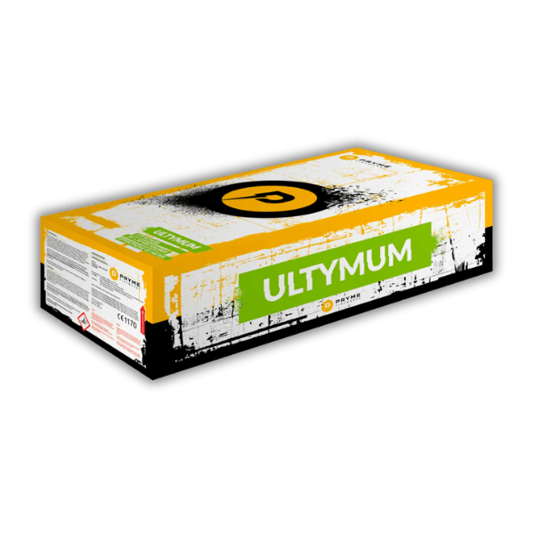 Die Pryme Ultymum ist ein XXL-Verbundfeuerwerk der Kat. F2 und kombiniert verschiedene Fächerungen und Schussfolgen: I-, Z-, V- und W-Shape. Die Show bietet eine beeindruckende Abwechslung aus Brokat- und Flower-Kronen, Titan-Gold-Palmen, Chrysanthemen, Blink- und Silber-Effekten sowie intensiven Aufstiegen. Ein echtes Highlight für Profis, allerdings durch die Gefahrgutklasse 1.3G ausschließlich zur Abholung an Pryme Stationen oder Fachhändlern erhältlich.