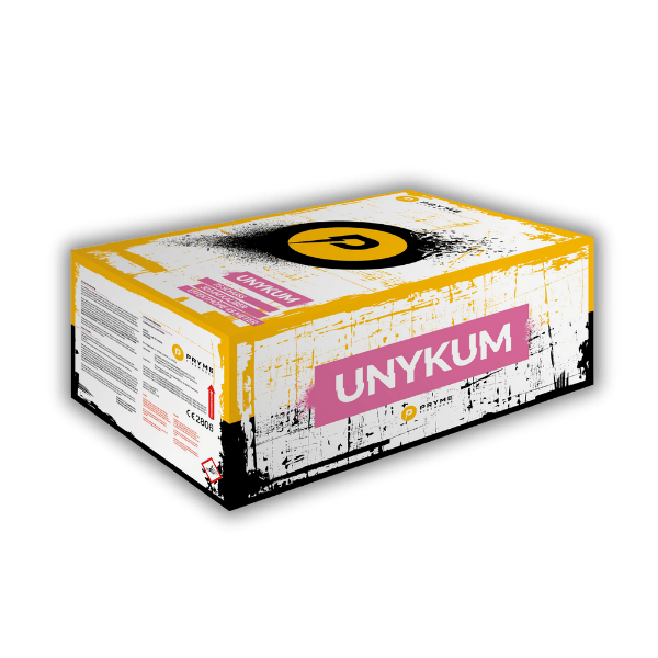 Die Pryme Unykum ist ein 75-Schuss-Verbundfeuerwerk im Kaliber 30 mm mit 1.418 g NEM. Über verschiedene Fächerungen und Schussfolgen entfaltet dieses Performance-Feuerwerk ein facettenreiches Spektakel: Silber- und Goldschweifaufstiege zu Brokatkronen mit farbigen Spitzen, Strobeffekte in Blau, Rot und Violett, sowie Goldspinner-Schweife mit Dahlien in Orange, Lemon und Pink. Abgerundet wird die Show durch eindrucksvolle Glitterweiden mit mehrfarbigen Sternen. Ein hochklassiges Komplettfeuerwerk für anspruchsvolle Pyro-Fans.