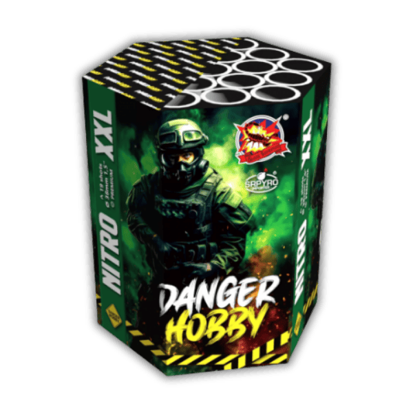 Die SR Pyro Danger Hobby Nitro ist eine Hochleistungsbatterie der Kategorie F3 mit 19 Schuss und einem massiven 38 mm Kaliber. Mit satten 756 g NEM liefert dieser Cake volle Power über ca. 40 Sekunden. Er beginnt mit bunten Kometenaufstiegen, die in verschiedenen, großflächigen Effekt-Kombinationen mit extremer Ausbreitung explodieren. Erwarte fette Zerleger und eine beeindruckende Himmelsfüllung. Abgabe nur an Inhaber einer behördlichen Erlaubnis.