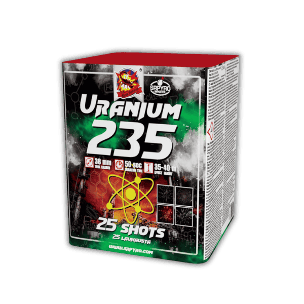 Die Uranium von SR Pyro ist ein absolutes Schwergewicht in der Kategorie F3. Mit einem gewaltigen 38mm Kaliber und fast einem Kilogramm NEM (970g) schöpft diese 25-Schuss-Batterie die rechtlichen Möglichkeiten voll aus. Die Schüsse steigen mit massiver Kraft auf und entladen sich in gigantischen Buketts mit einem Zerlegerdruck, der in der Magengrube zu spüren ist. Wer maximale Ausbreitung und brachiale Gewalt am Himmel sucht, kommt an der Uranium nicht vorbei. Ein Highlight für jedes professionelle Silvesterfinale.