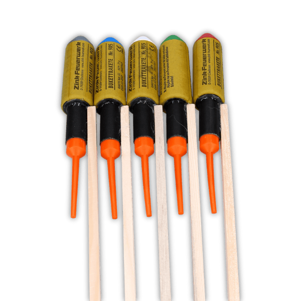 Die Zink 905 Bukettraketen sind ein beeindruckendes Sortiment großer Silvesterraketen der Kategorie F2, die mit jeweils 75 g NEM aufwarten. Der Mischbeutel enthält fünf verschiedene Zink Raketen, die sich durch ihre Kappenfarben unterscheiden. Erleben Sie majestätische Buketts wie weiße Blinker (weiße Kappe), die Kombination aus weißen Blinkern und Rot (gelbe Kappe), Brokat und Blau (blaue Kappe), Tremolant und Violett (grüne Kappe) sowie Silberweide und Rot (rote Kappe). Die Raketen sind in F2 eingestuft; der Erwerb ist in Deutschland ausschließlich Pyrotechnikern mit entsprechender Erlaubnis vorbehalten.